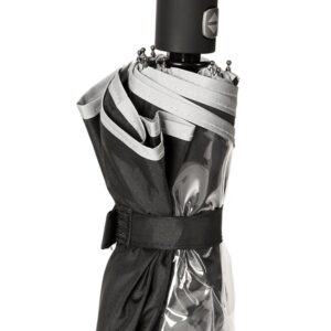 Huomio-sateenvarjo ikkunalla ja heijastavalla reunuksella avautuu ja sulkeutuu automaattisesti napin painalluksella. Varjo suojaa niin sateelta kuin liikenteeltä. Heijastava reunanauha tekee sinut näkyväksi hämärässä ja pimeään aikaan. Yksi sateenvarjon lohkoista on läpinäkyvä, jonka ansiosta näet kadulla kulkiessasi eteesi vaivatta, vaikka varjoa pitäisi tuulen vuoksi kallistaa eteenpäin.