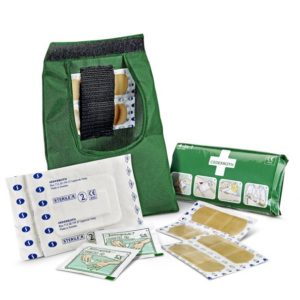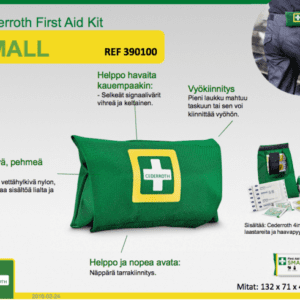 Ensiapupakkauksen kuorimateriaali on kestävää nylonkangasta, joka suojaa tuotteet lialta ja pölyltä. Käytännöllinen tarrakiinnitys auttaa avaamaan laukun nopeasti.